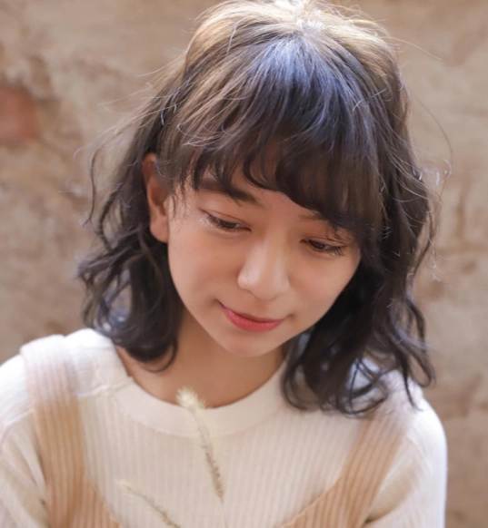 丸顔さんのミディアムヘアは、動きを出しフェミニンに仕立てたパーマスタイルが人気。前髪に動きを出すことでボリューム感があるスタイルも楽しめます。