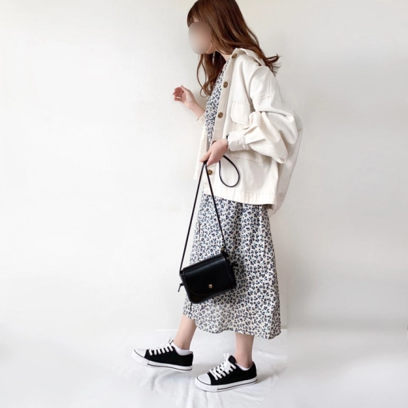 女性らしい花柄のワンピースと、メンズライクな雰囲気のある白デニムジャケットを組み合わせたモノトーンコーデ。黒白カラーのメリハリが効いて程良い甘辛ミックスコーデになっています。靴はカラートーンをそろえた黒のスニーカーで、全体的にまとまりのあるバランスに。