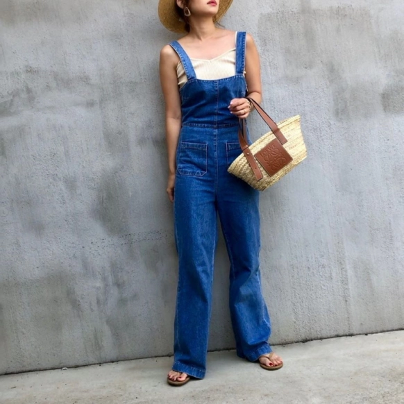 カジュアルコーデの定番デニムサロペットも、ベージュサンダルとの相性が良いです。写真のように、デニムサロペット以外を同系色にすることでまとまりのあるコーデのできあがり!