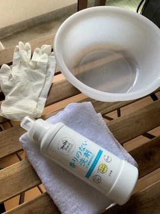 3.たらいの中の洗剤液を流し、水道水を入れマスクをすすぐ