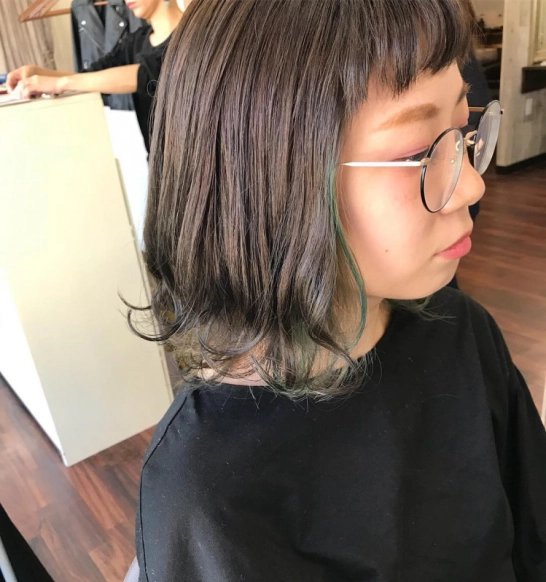 とはいえ、全体をグリーンカラーにするのはちょっと勇気がいりますね。画像のように、顔周りに少し見える程度にインナーカラーを入れると、ナチュラルに取り入れられます。ベースカラーは、アッシュ系にするとなじみやすく、トレンド感が出るのでおすすめですよ。インナーカラーはなるべくハイブリーチをして明るい色を入れてみてください。また、ヘアカットも画像のように毛先に動きのあるスタイルにすれば、イエベ春タイプの方の柔らかでかわいらしいイメージにマッチします。