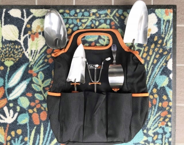 「Amazon(アマゾン)」で購入できる「ガーデニングツール7点セット 初心者向け 」2,980円(税抜)は、ガーデニングに必要な道具がすべてそろっているセットです。セット内容は、移植ゴテ、鋤、くまで、摘果鋏、剪定鋏、霧吹き、収納袋です。収納袋がついているので土がついた状態でも安心して保管できます。