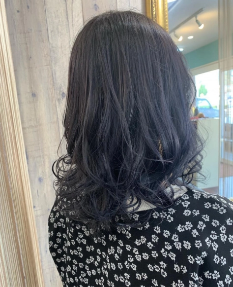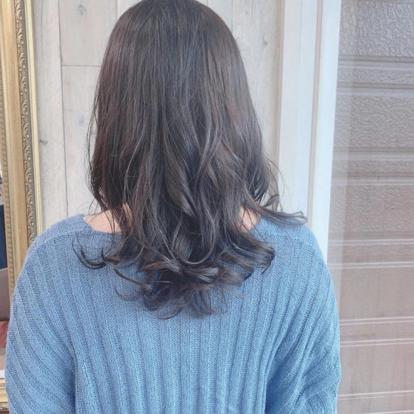 髪を巻くとクールな質感のツヤがきわだち、大人っぽい抜け感が出ますね。落ち着いた印象にしたい方へおすすめのカラーです。