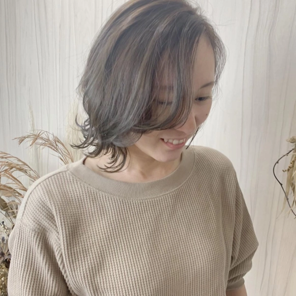 やわらかなツヤのあるアッシュカラー。地毛の黄みが強い場合はカーキっぽい色味になる場合もありますが、それはそれで秋色を感じさせてすてきですよね。