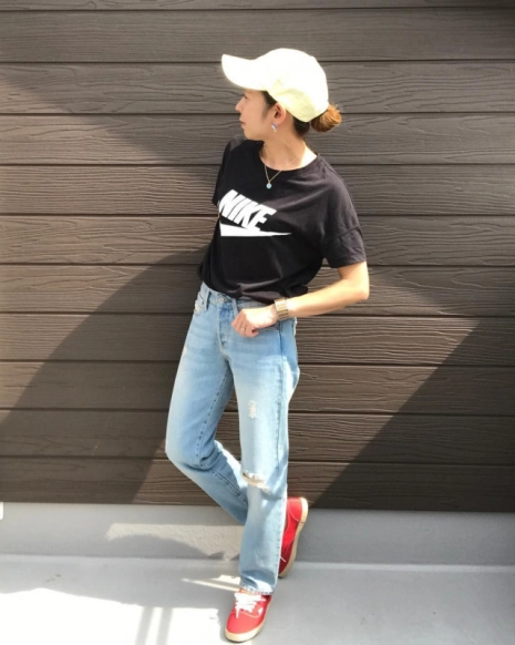 白のTシャツと黒のゆったりパンツのモノトーンコーデは、メンズライクなファッションですが、赤のスニーカーをいれることでかわいらしさがプラス。足元にアクセントをいれることで抜け感を演出し、おしゃれな着こなしに仕上げています。シンプルなファッションには、積極的に取り入れていきたいアイテムです。