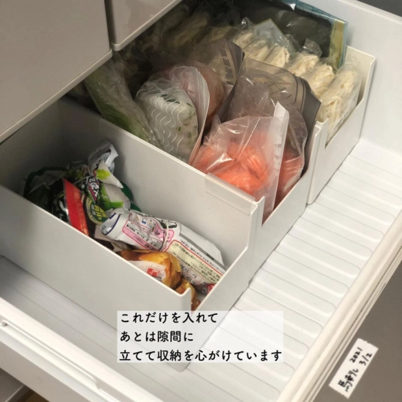 買いだめをしたり作り置き冷凍したりすると、いっぱいになってしまう冷蔵庫。気がついたら賞味期限が切れてた…なんて経験がある人はいませんか?スキットを使えば、自分の使いやすいようにカテゴリーを分けて収納でき、食べ忘れも防げます。