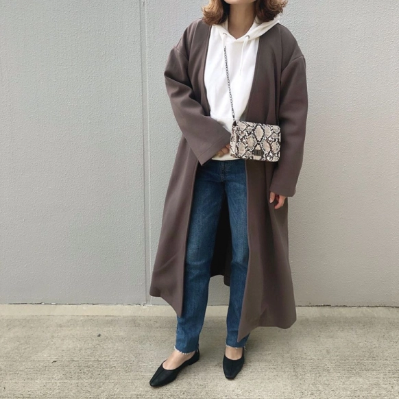 白のパーカーにブラウンのコートを合わせればスタイリッシュでモードな雰囲気を演出できます。プルオーバーパーカーは、すっきりとしたスキニーとの相性は抜群です!@red_sjkさんはシンプルなコーデにパイソン柄のバッグを合わせてかっこいい大人女子スタイルになっていますね!