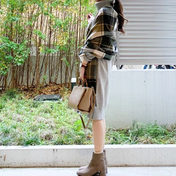 チェック柄のストールをゆるく巻いた@ shizuka.watanabeさん。ロング丈のスカートをはいても首元にストールがあることでバランス良く仕上がります。縦ラインを意識したストールの巻き方でスタイル良く仕上がっています。