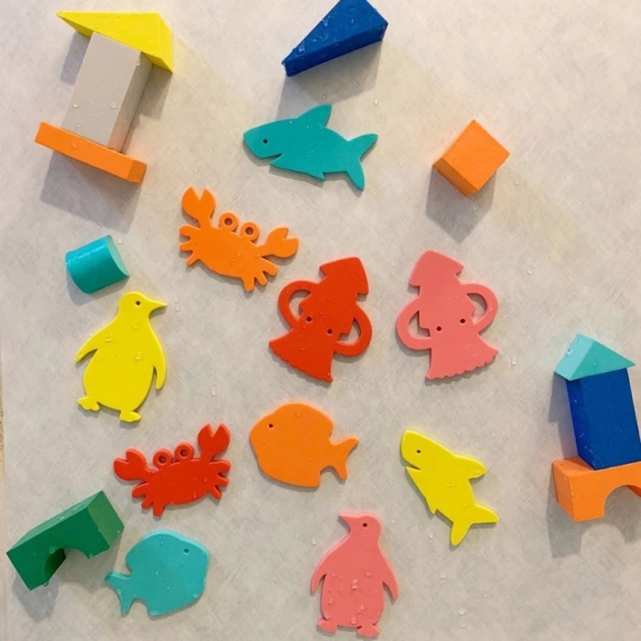 もうひとつは、立体的な「EVAブロック 32PSET」。画像には全て映ってはいないのですが、四角や三角などさまざまな形が32個セットで、自由に組み合わせて遊べますよ。こちらも、貼って浮かべて楽しめますし、乾かして室内でブロックにしてもOK!