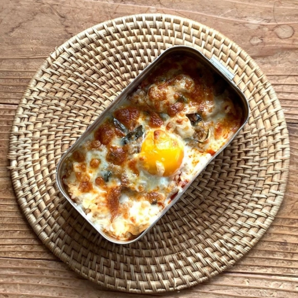 こちらは@nozomi._._.yさんがスンドゥブをリメイクして作った、スンドゥブチーズリゾット。前の晩に作ったスンドゥブの残りにごはんを混ぜ、チーズと卵黄をのせてオープンで焼くだけと簡単です。卵黄を固めたくないなら、後のせがいいかもしれません。辛いスンドゥブがまろやかになり、また違ったおいしさを楽しめます。