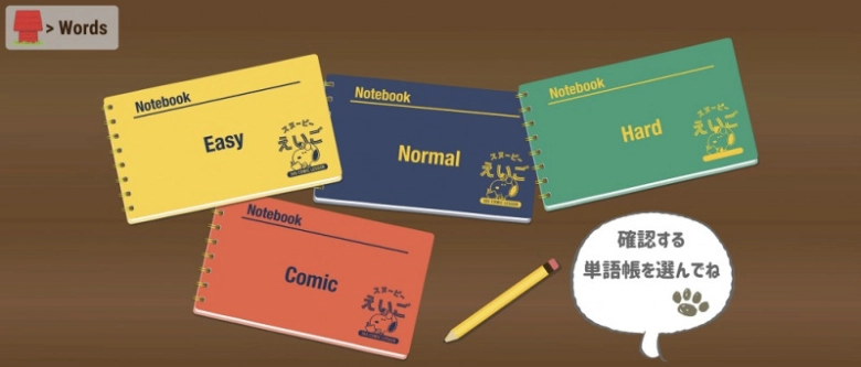 さらにコミックに登場した単語は、チェックを入れればトップ画面にある「WORDBOOK」にレベル別に記憶されます。