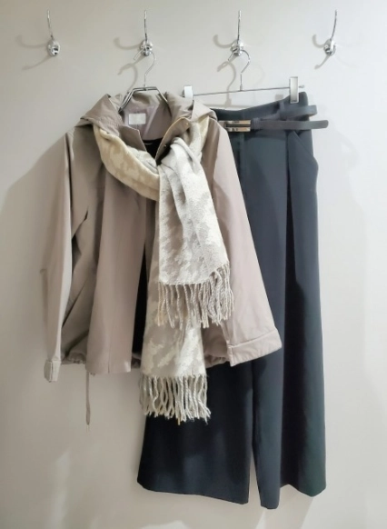 ボリューム感の少ないマフラーなら、ゴワゴワせずにフードの下に巻きつけ可能。キレイめの大人コーデが完成します♡
