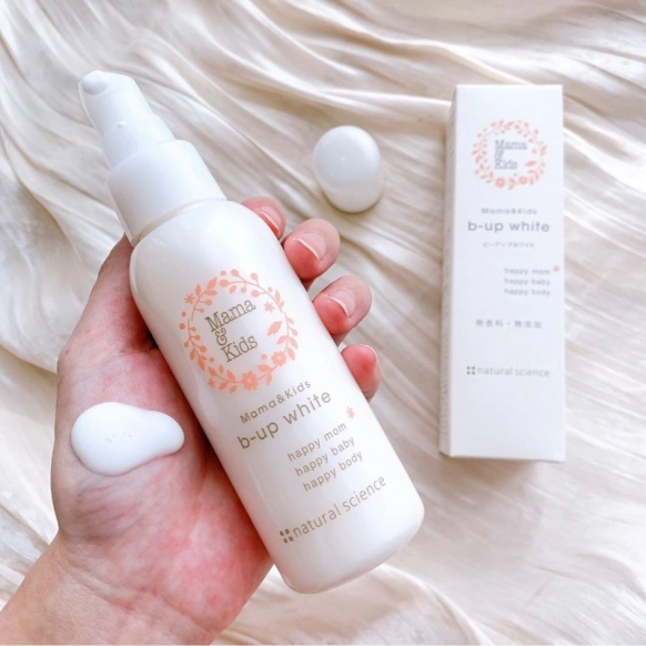 ママ&キッズの「b-up white(ビーアップホワイト)」は、バスト・デコルテ専用のケアクリーム。妊娠線はお腹だけでなくバストにできることもあります。妊娠中はもちろん、産後の授乳中から卒乳後まで、変化の大きいバストまわりの肌をケアしてくれるアイテムです。たるみ・くすみ・乾燥といった悩みを同時にケアして、うるおいを与えてくれます。