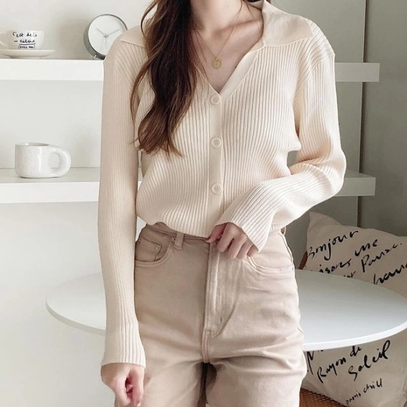@rmrmrm0424さんはタイトめのVネックカーディガンをパンツにインして、すっきりと着こなしています。上下の服を同系色のグラデーションでまとめると柔らかい印象に。カーディガンをボトムスにインするスタイルは、韓国ファッションでもトレンドの着こなしです。