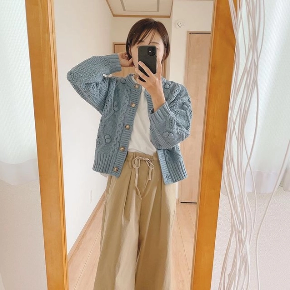 くすみブルーのニットカーディガンは、コーデが甘くなりすぎないのがポイント。ベーシックなカラーと相性が良く、きれい色の中でも特にフェミニンな大人っぽさをプラスしてくれます。