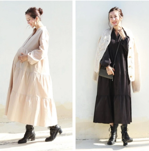 臨月間近の場合は、コーデュロイやニットなど厚めの生地のワンピースを選ぶのがおすすめです。