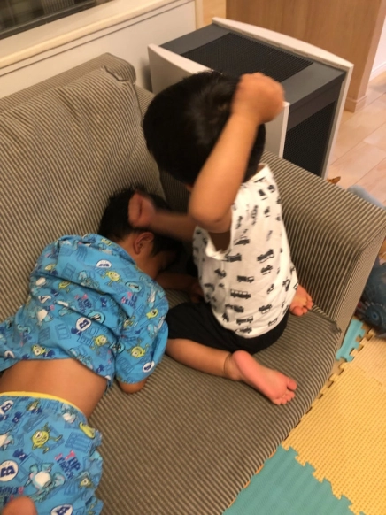 21:15 「そろそろ寝るで~」と号令。3人でベッドへ。 決まってベッドでは息子たちのケンカが始まるので、