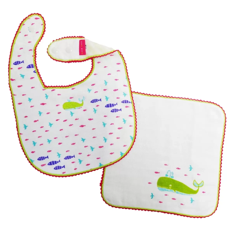 こちらは日本が誇る今治タオルのよだれかけ。通販限定商品です。スタイの首物はスナップボタンになっており、2段階に調整可能。ハンドタオルとセットになっており、どちらも吸収性はバッチリです!