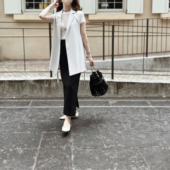 気温の安定しない春や秋に使えるのが「ベスト」。特にミドル丈のベストは体型をカバーしてくれつつきちんと感も出してくれる優秀アイテムです。パキっとした白ではなく、アイボリーやグレージュ系の白を選べば柔らかい雰囲気をまとえます。