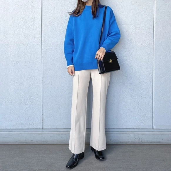 まずは青ニット×オフホワイトのパンツコーデ。パキッとした青が目を惹くコーデで清潔感のある仕上がりになっています。明るいブルーと淡いホワイトのクリーンな配色は、春に向かう今からは特に気になるカラーバランス!メリハリ効果で、低身長さんでもスラっと見えるおすすめの着こなしテクとして参考になりそうですね。