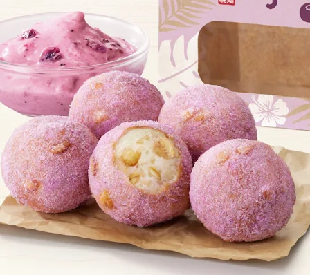 「コナズ珈琲」監修!アサイーボウルをイメージした「うどーなつ アサイーベリー味」。もっちもちの生地にグラノーラをたっぷりと練り込んだ「ザクもち食感」と、アサイーベリーのすっきりとした味わいが特徴。