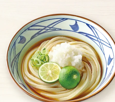 徳島県産すだちを丸ごとひとつ使用した、ひんやり爽やかな「すだちおろしぶっかけうどん」。水で締めたのど越しの良い冷うどんと冷たいぶっかけだし、すだちを丸ごとひとつ、大量の大根おろしの組み合わせは食欲のない日も箸が進む!