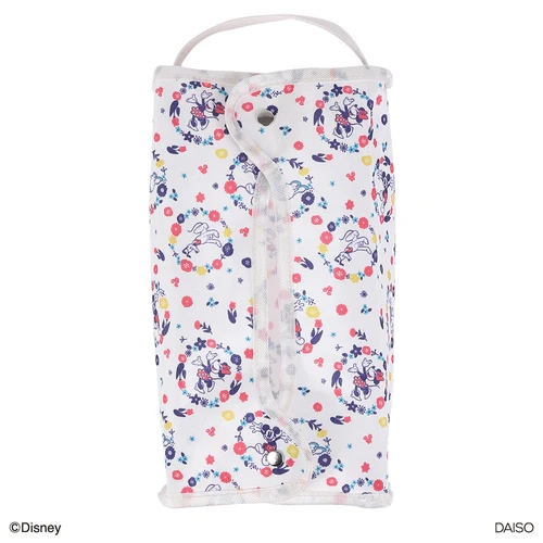 ミッキーやドナルドなど、ディズニーのキャラクターがプリントされた「ティッシュケース」も、ダイソーの人気商品のひとつ。吊り下げ用のフックひもがついているので、車や壁など、フックのある場所にかけて使えます。