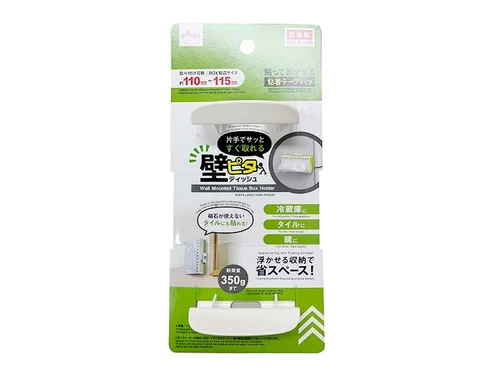 「壁ピタティッシュ」は、何度でも貼ってはがせる粘着シールがついたアイデア商品!ティッシュボックスをはめるだけで、浮かせる収納が叶うティッシュホルダーです。タイルやプラスチックに引っつけられるため、マグネットがつけられなくて浮かせる収納できないとお悩みの方にピッタリですよ。