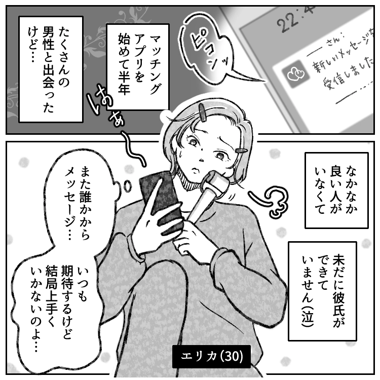 絶賛婚活中のエリカ(30)はマッチングアプリを始めて半年経つが、未だに良い人と出会えていなかった。結局いつも上手くいかないと諦めかけていると、なんといきなり好条件のイケメンからメッセージが届く。ルンルン気分で彼とのデートに挑むエリカであったが、初デートでとんでもない事件が起きることに!?