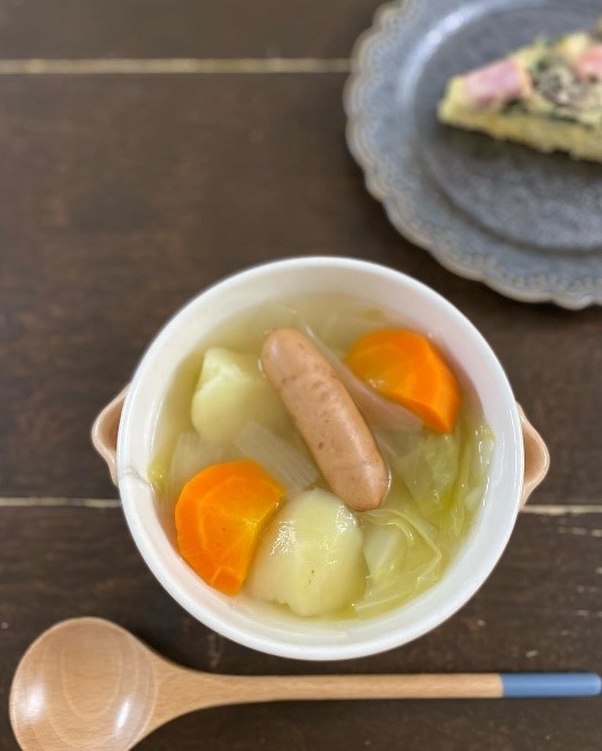 - 1.ウインナー・玉ねぎ・人参・キャベツ・じゃがいもを好きな大きさに切り、白だし・塩・水と鍋に入れる