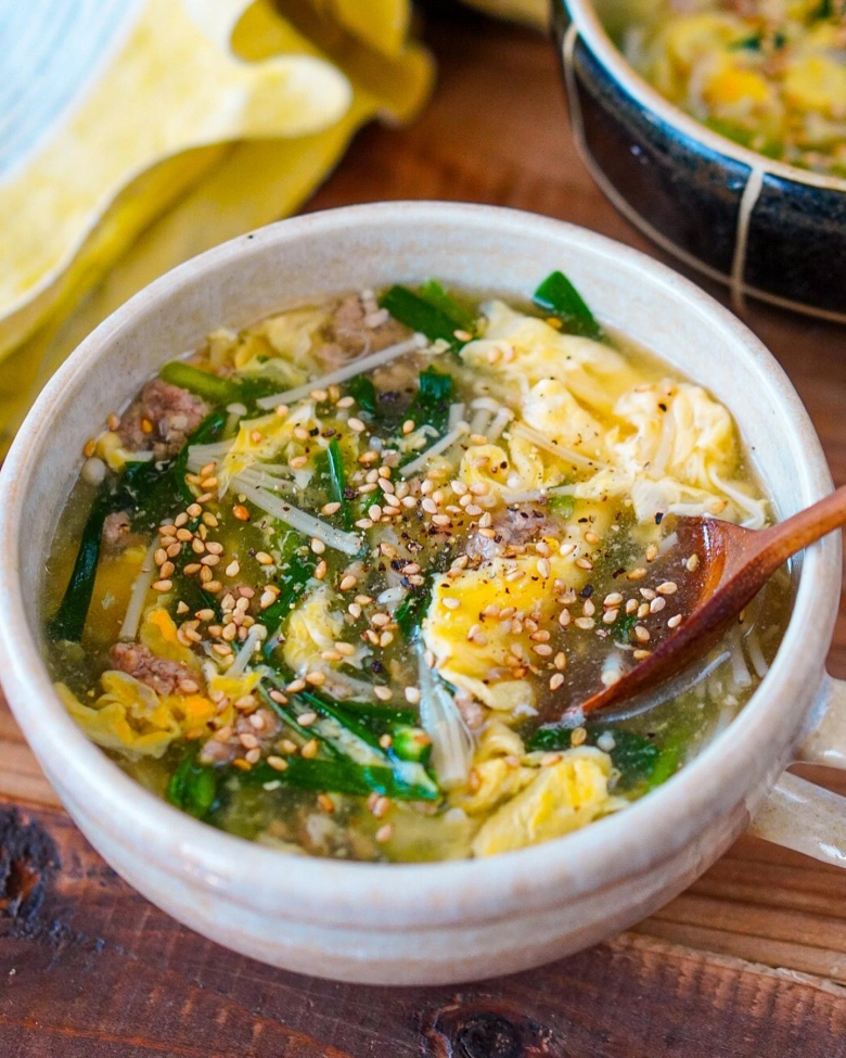 ニラ、ひき肉、えのきが入った具沢山の中華風の卵スープ。これだけでも食べ応え満点。卵のまろやかな風味をニラがグッと引き締めてくれます。ひき肉を鶏肉に、えのきを椎茸に変更したりしても◎お好みでいりごまやラー油を散らしてもおいしいです。