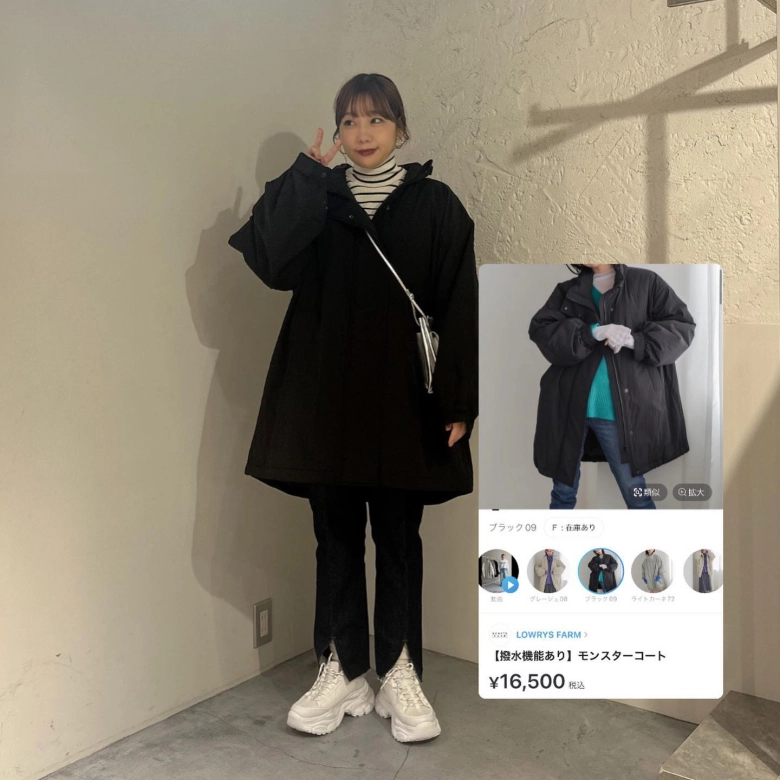 こちらのコーデのように、アウターとボトムスをブラックでまとめれば、全身が引き締まって見えて着痩せ効果を十分に発揮できるでしょう。ただし、重くなりすぎないように、スニーカーや首元からチラ見えするトップスは、ホワイトなどの明るい色味を使うのがおすすめ。