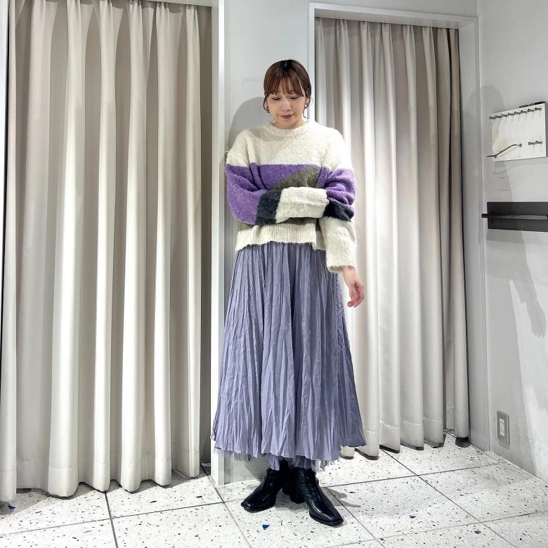 秋にぴったりなパープルカラーをメインに作る、季節感を意識したコーデ。裾が広がったAラインスカートに、ニットのトップスを合わせただけのシンプルなアイテム使いですが、上下の色味が合っているので全体がすっきりした印象に。