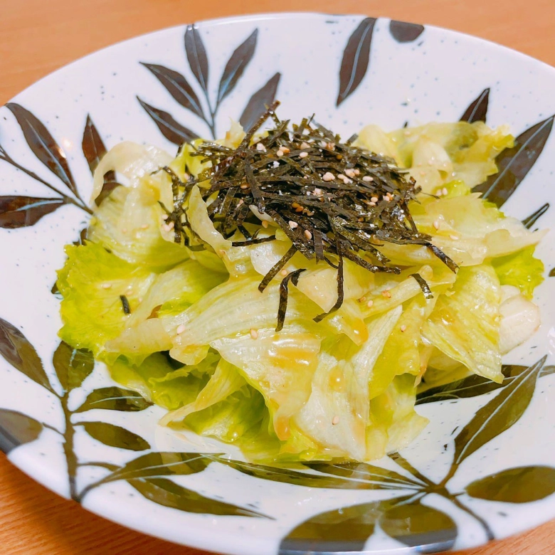 シャキシャキとしたレタスに、ごま油やめんつゆなどの調味料を和えて刻み海苔を乗せるだけで、コクのあるサラダの完成!鯖の塩焼きの箸休めとして、またお酒のお供にもぴったりな万能サラダです。