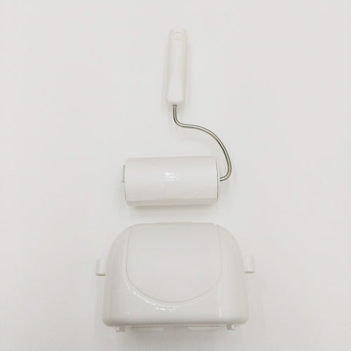 明るいホワイトがどんなインテリアにもなじみやすい、ミニサイズの粘着クリーナー。丸っこい形がコンパクトでかわいらしい外観です。ケースには左右どちらからでも差し込め、狭い場所の掃除におすすめ。使うときはフタを開け、本体を取り出します。テープ交換をする際はストッパーを内側に縮め、芯を引っ張り出し、新しいものを差し込めばOK。