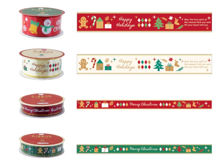 クリスマスを思わせるイラストが描かれ、リボンの両サイドにゴールドのラインが入っているサテンリボン。包装紙やラッピングバッグにプレゼントを入れた後、リボンを巻いてあげるとさらに特別感のあるクリスマスプレゼントに仕上がりますよ♡