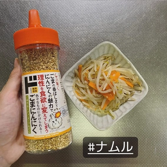 @dondon_shoppingさんの使い方は、もやしのナムルに振りかけるというもの。ナムルにごまは鉄板の組み合わせですね。いつものごまをドンキのごまにんにくに変更すると旨味が加わり、ナムルがレベルアップするでしょう。