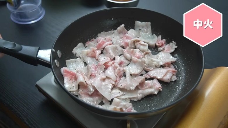 フライパンに油を引いたら、ひと口サイズにカットした豚肉をほぐしながら入れます。