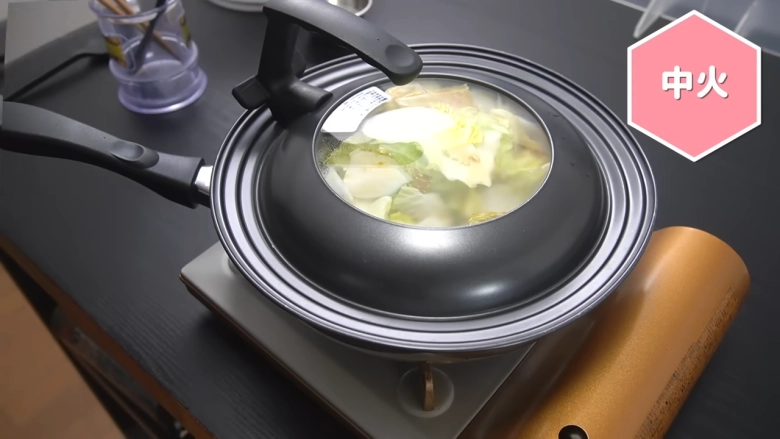すべての食材・調味料を入れたら、フライパンにふたをして約1分間蒸し焼きにします。