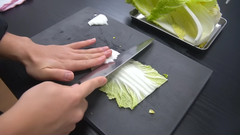 白菜をカットするときは1枚ずつ、白い部分はそぎ切りにするのがポイントです。そぎ切りにすると断面が広くなるため、短時間で火が通り、旨味も出やすくなります。