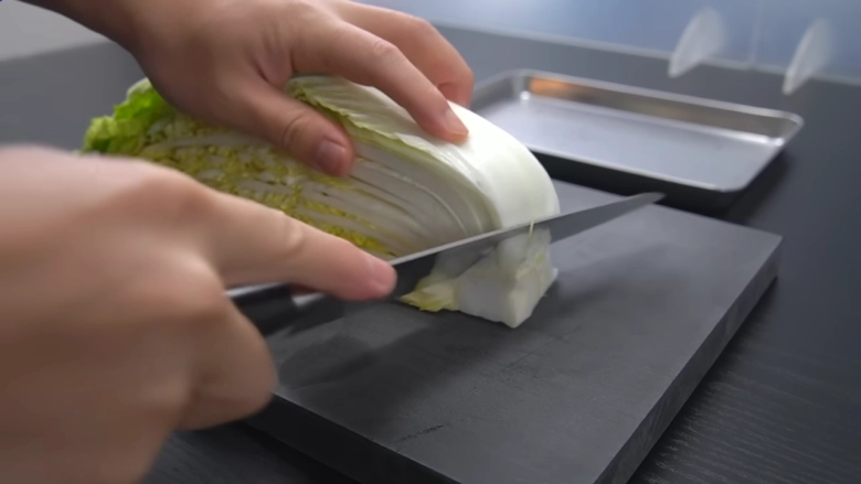 白菜の芯ギリギリの位置に包丁を斜めに入れます。