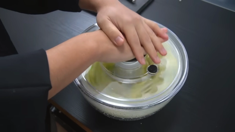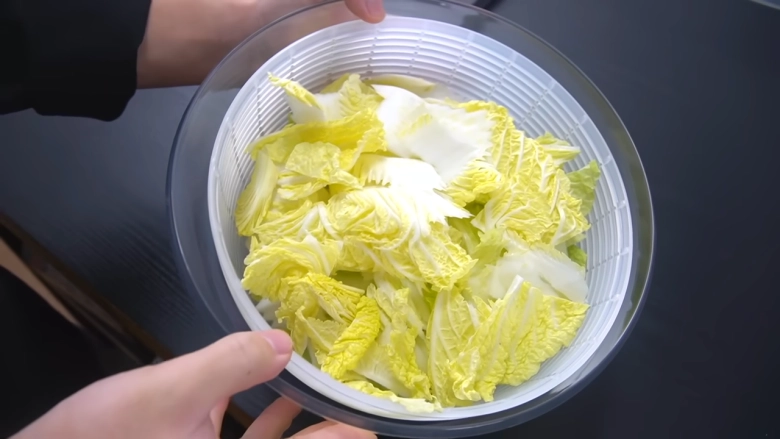 サラダスピナーでしっかりと白菜の水気を取ります。