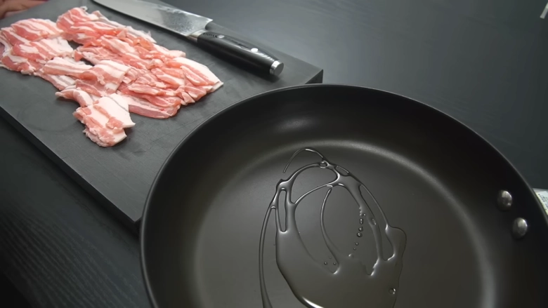 フライパンを中火で熱し、塩ひとつまみとこしょう少々を加えて味を整えましょう。