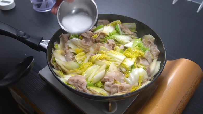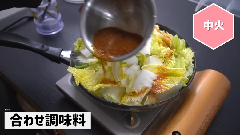 白菜を入れたら、あらかじめ作っておいた合わせ調味料も加えましょう。