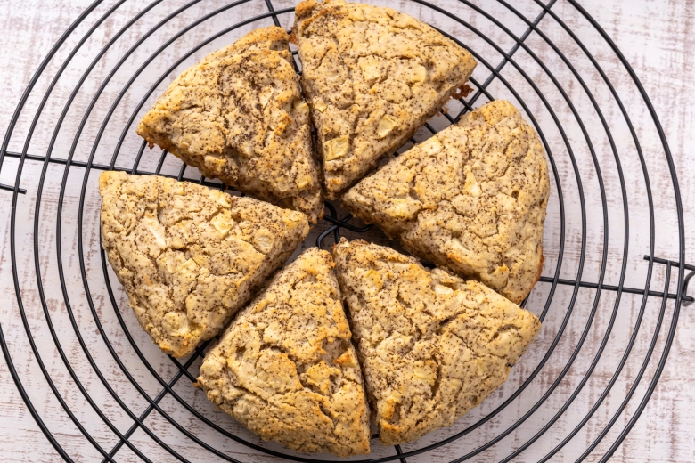 - 切り分けたスコーンをベーキングシートを敷いたトレイに並べ、予熱したオーブンで約15分間焼きます。