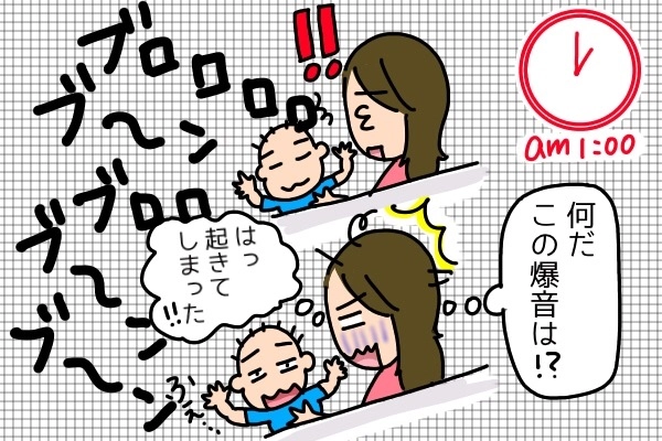 外からものすごい爆音が!!嘘やろ……。10秒で起きてしまったやないかい!!