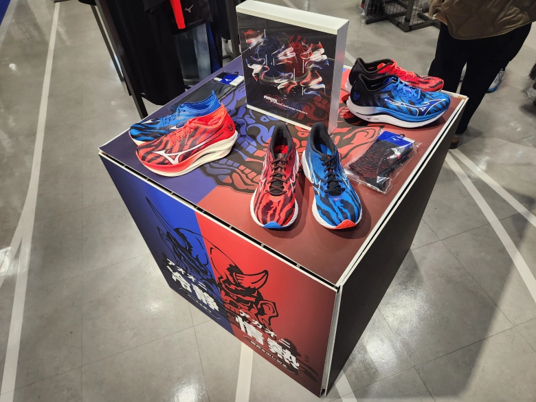 MIZUNO TOKYOに入ってすぐに目に飛び込んできたのは大阪マラソン2025仕様の”アオオニ、アカオニ”のシューズ。冷静にペースを保つ「青鬼」と、情熱で限界を出し切る「赤鬼」を左右非対称のデザインで表現しているそうです。