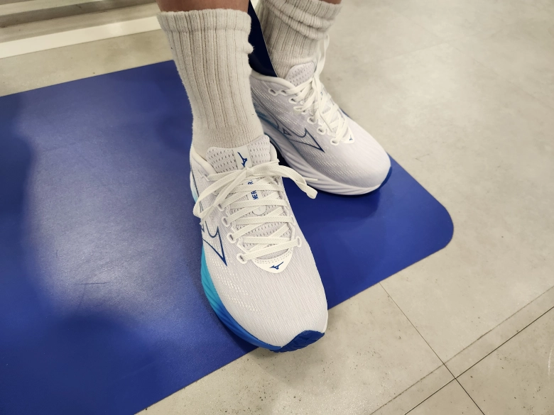 足のサイズ23.5cmの私にオススメのランニングシューズのサイズは+1cm大きい24.5cm。浮指気味の傾向があるので、しっかりと地面をとらえることができるMIZUNO NEO ZENを選んでもらいました!
