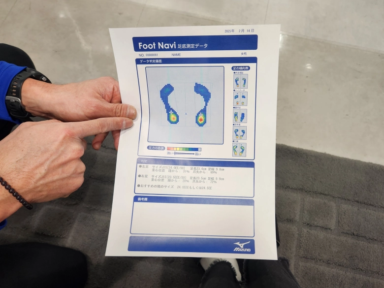 そして本日の目的は専門のスタッフさんに直接アドバイスをしてもらうこと。こちらではFoot Naviというサービスがあり、正確なサイズから足の傾向、オススメのシューズサイズまでをデータで出してくれるんです。専用の測定器に乗ってすぐに結果が出るので気軽に計測ができますよ!