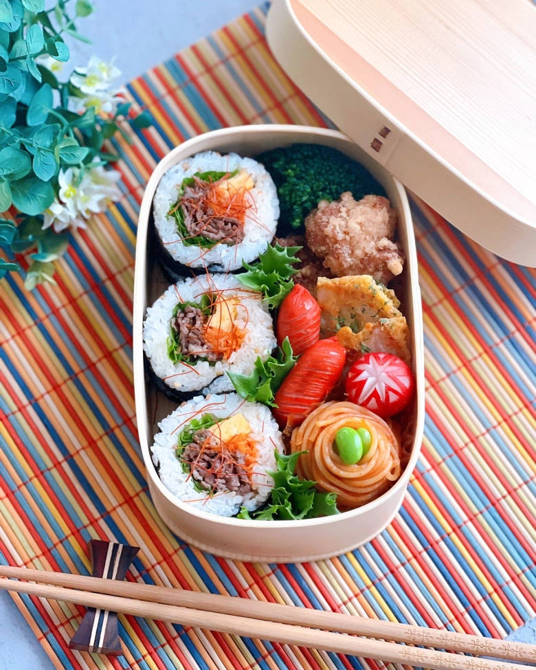 家族で食べる大きなお弁当では、食べやすさだけでなく取りやすさもポイント◎ピンチョスや肉巻きは、華やかさと取り出しやすさの両面を兼ね備えたおかずです!